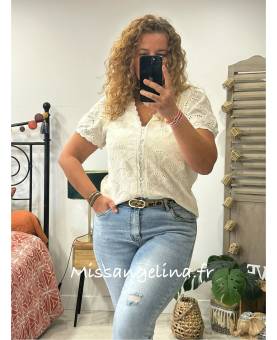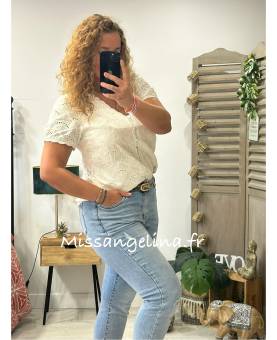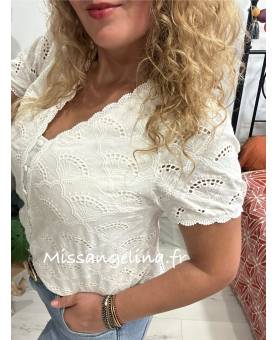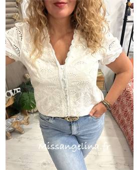 BLOUSE EN DENTELLE BLANCHE COL V A PETITES MANCHES.
