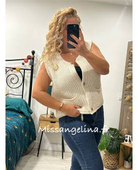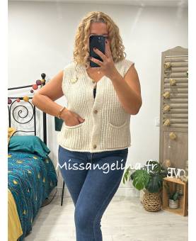 Gilet en maille sans manche de couleur écru avec broche doré offerte.