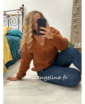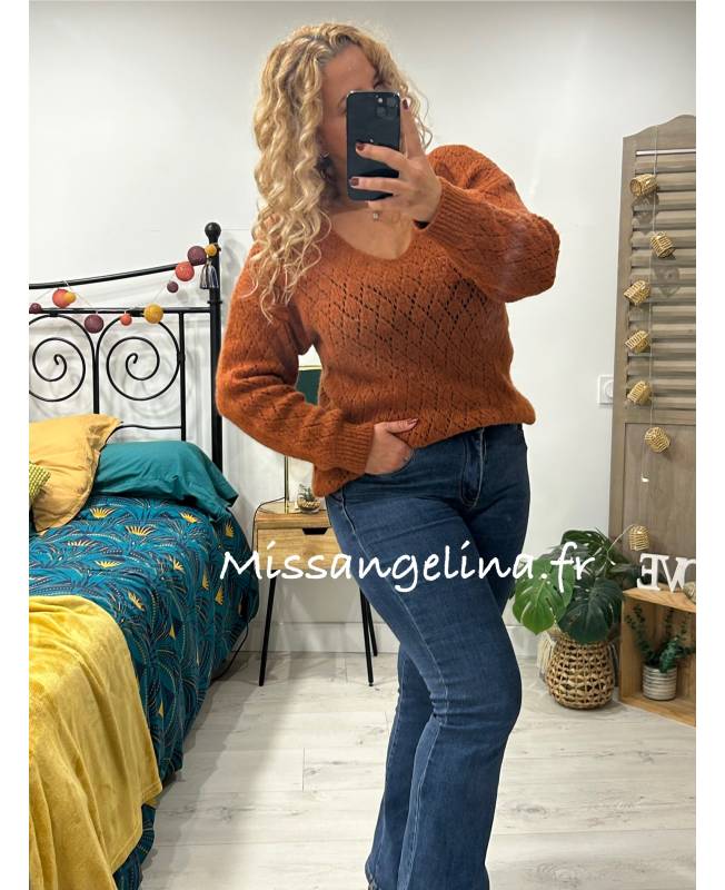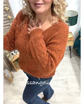 PULL LOOSE EN GROSSES MAILLES AJOURÉE D' UNE JOLIE COULEUR ROUILLE.