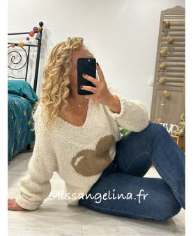 Pull en maille blanc avec un grand coeur beige sur le devant.