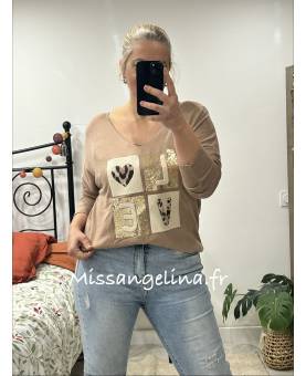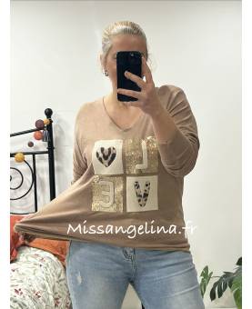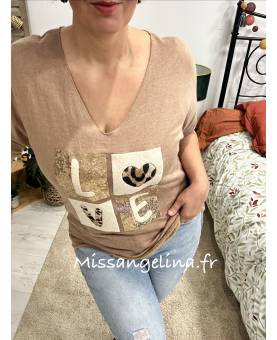 PULL FIN COULEUR CAMEL AVEC LOVE EN MOSAIQUE SUR LE DEVANT.